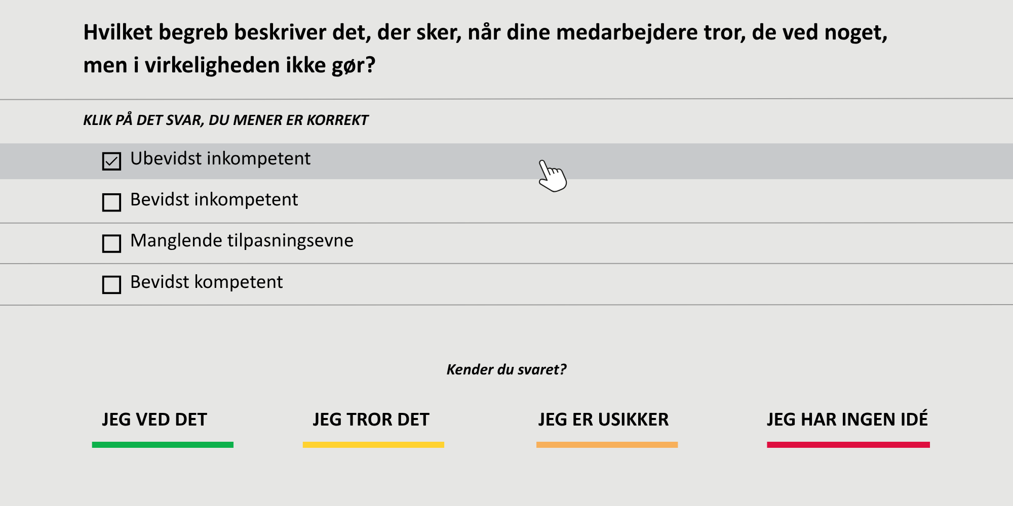 Som vi også forklarede på mødet, skal medarbejderen altid vurdere, hvor godt man selv mener, man har styr på emnet. Det gør man ved altid at trykke på en af følgende valgmuligheder - ellers kan man ikke gå videre. Dette har også en betydning for den individuelle læringssti; er man usikker og svarer forkert, vil læringsstien forlænges, men er man selvsikker og svarer rigtigt, vil læringsstien forkortes.